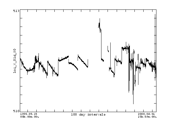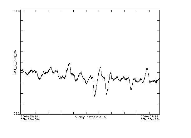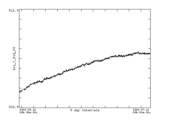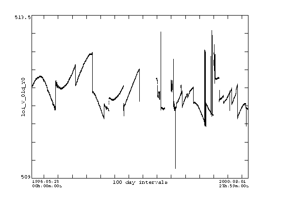 The first plots are X0 and Y0 for May 1996 to Aug 2000. The jumps are times when the legs were moved, and/or when the pointing offset was changed and/or times when focus was changed. Clearly the X0 data is noisier than the Y0 data. This is to be expected since solar rotation carries structures past the EW limb sensors but not past the NS sensors. A plot of about 2 months in the spring of 2000 are also shown. The signature of activity rotating over the limb can be seen in the X0 data. This represents real motion of the image on the CCD. Any analysis that cares about the exact position of the image must use X0 and Y0 (or their derived quantities - see Lev2 keywords info) to determine the disk center coordinates.