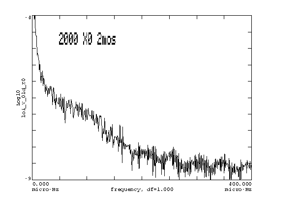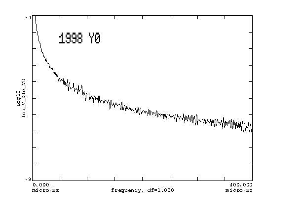 This plot is the ratio of the 3-month spectra for X0 for 2000 / 1998. It can be seen that most of the difference is at low frequency, below about 20 microhz which corresponds to about 14 hours. Thus in the g-mode band from 1 to 12 hours where we might reasonable search MDI data there is little difference from 1998 to 2000. There is less power in the 3-month 2000 segment above 200 microhz than in 1998. Do not know why.