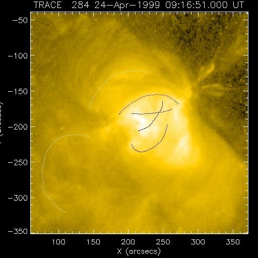These traced loops are overplotted on nearly simultaneous TRACE images as in the following figures (click to enlarge). They are (from left to right) at 284 Å, 195 Å and 171 Å.