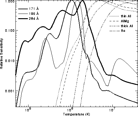 It has been known for almost three decades that the solar corona is comprised of closed loops. Despite vast theoretical efforts, it seems to be a long way before we feel we understand the mechanism by which these loops are heated to coronal temperatures. One thing that complicates comparisons between theory and observed data may be the presence of loops of different temperatures ranging 0.5-10 MK, even ignoring hotter loops created in major flares. No single instrument to date is sensitive to all these temperatures. For example, the plot below (click to enlarge) shows that SXT, a grazing-incidence telescope, is sensitive to a broad temperature range, but that its sensitivity drops dramatically below 2-6 MK depending on the filter. In contrast, TRACE, with normal-incidence optics, has more peaked sensitivities toward lower temperatures.