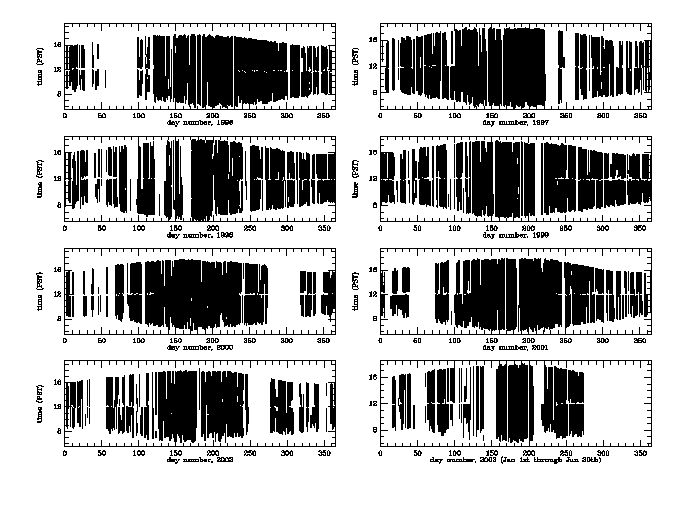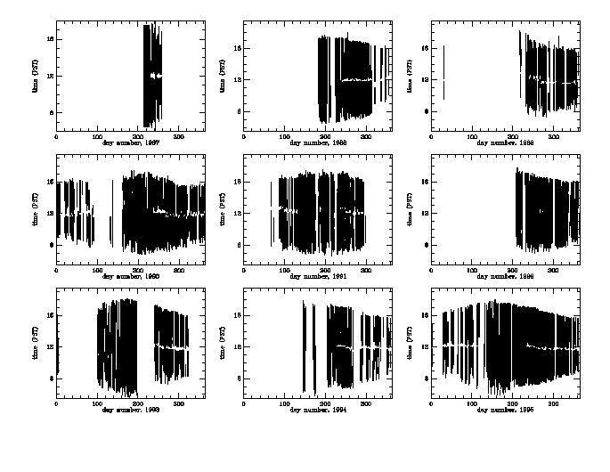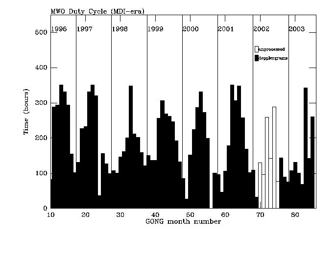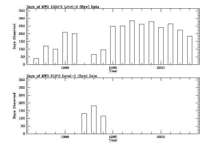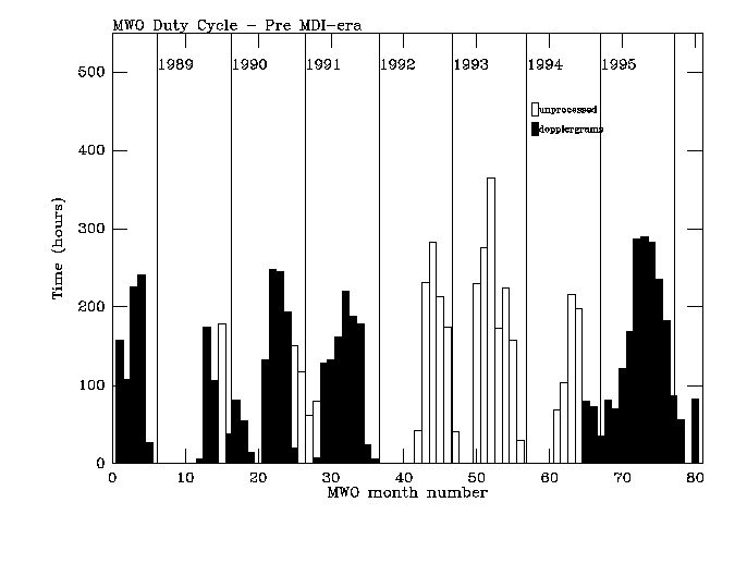 Observation histories for all 17 years of the Level-0 filtergrams are broken down into two categories; the pre-MDI era, and the MDI-era. The MDI instrument on the SOHO spacecraft became operational in early 1996, so observation histories are broken down into year ranges of 1987 through 1995 and 1996 to current date.